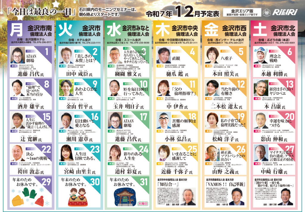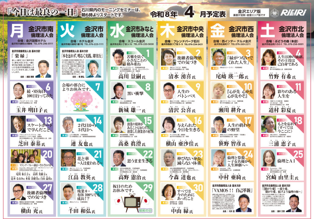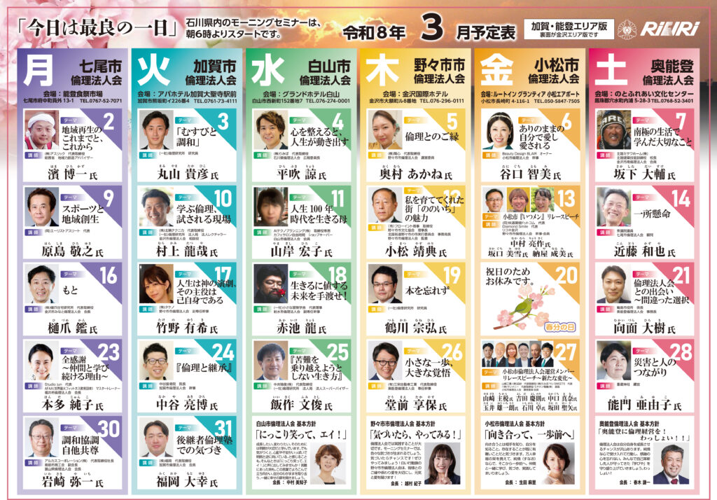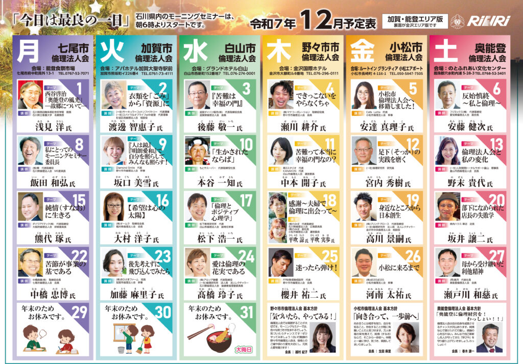 職場の明朗化と企業の活性化のために「倫理経営講演会」「経営者の集い」等を全国的に開催しています。また、経営者の学習活動として、毎週1回、朝6時から全国754ヵ所で「経営者モーニングセミナー」を開いています。